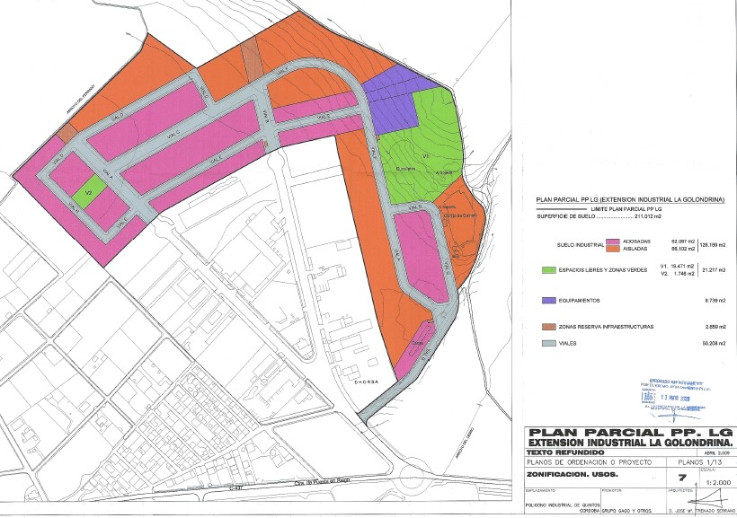 Extensión industrial La Golondrina Superficie total: 210.012 m2. Superficie lucrativa: 128.189 m2. Usos y zonificación de suelo: IND AD (adosada); IND AS (aislada).