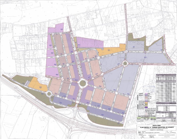 Parque industrial de Levante Superficie total: 838.878,17 m2. Superficie lucrativa: 419.280,79 m2. Usos y zonificación de suelo: IND 1(escaparate); IND 2 ADS (adosada); IND 2 AIS (aislada); IND3 (logísticas); IND T (terciaria).